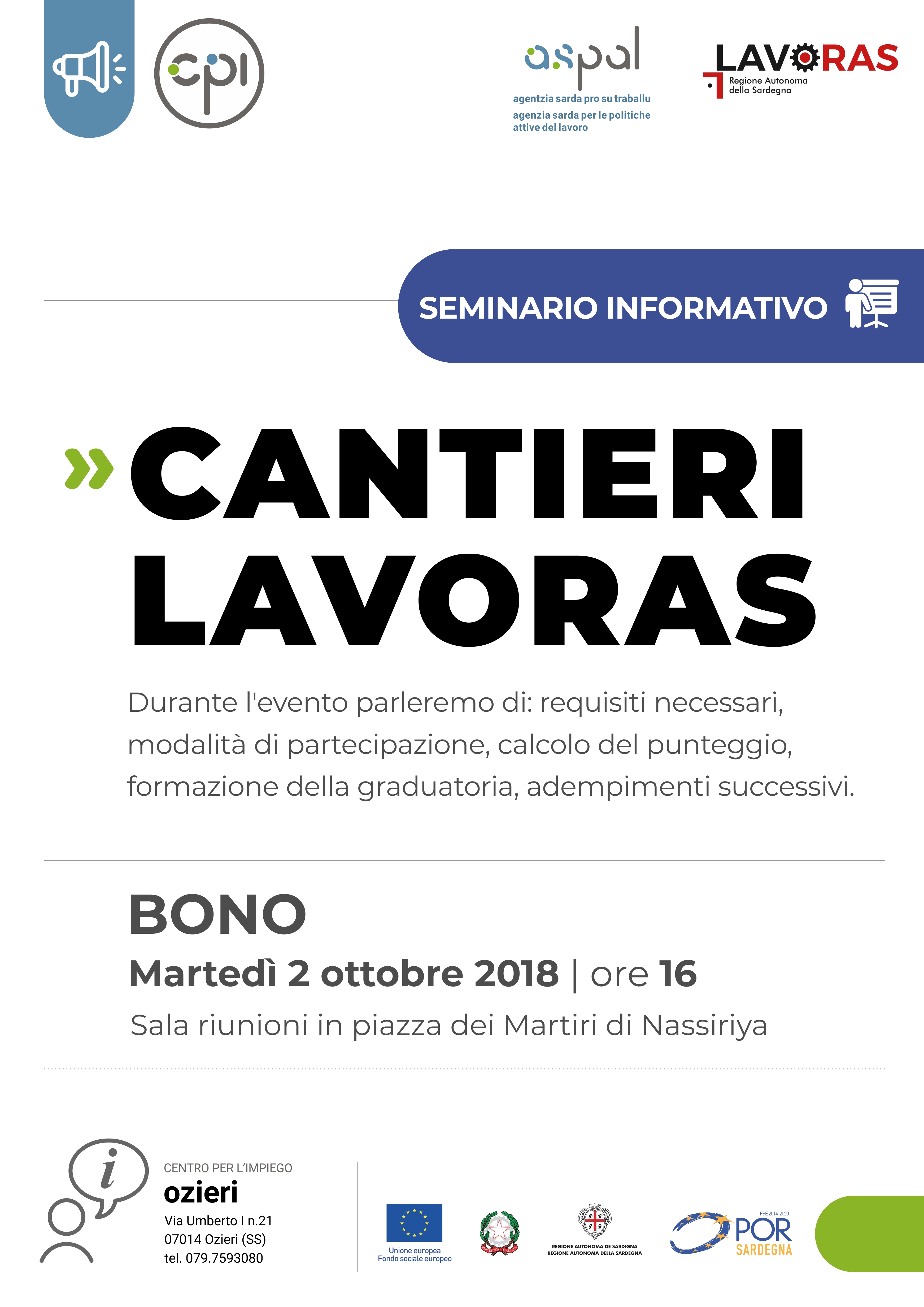 Il Centro per l’impiego di Ozieri organizza un seminario informativo sui cantieri previsti nel bando LavoRas; l’evento sarà a Bono, martedì 2 ottobre alle 16, nella sala riunioni di piazza dei Martiri di Nassiriya.